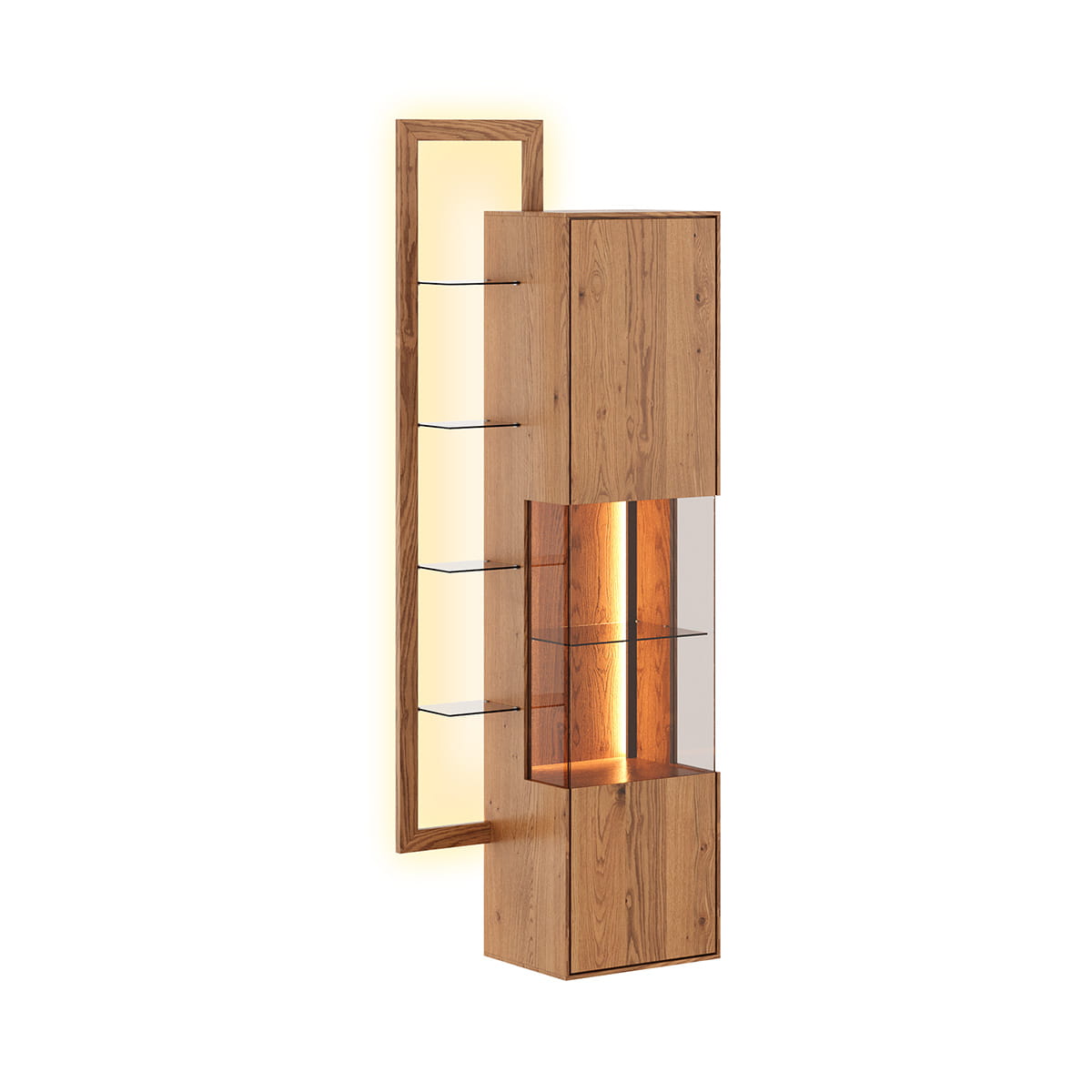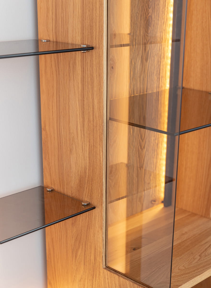 Kombinácia estetiky a funkčnosti vo vitríne z olejovaného dubového dreva je dokonalým riešením pre tých, ktorí hľadajú originálny a zároveň užitočný kus nábytku. Vďaka zabudovanému osvetleniu môžeme v miestnosti vytvoriť nádhernú atmosféru a zdôrazniť charakter vybraných exponátov. Takéto premyslené riešenia robia z tejto vitríny nielen kus nábytku, ale aj skutočnú ozdobu každého interiéru.
