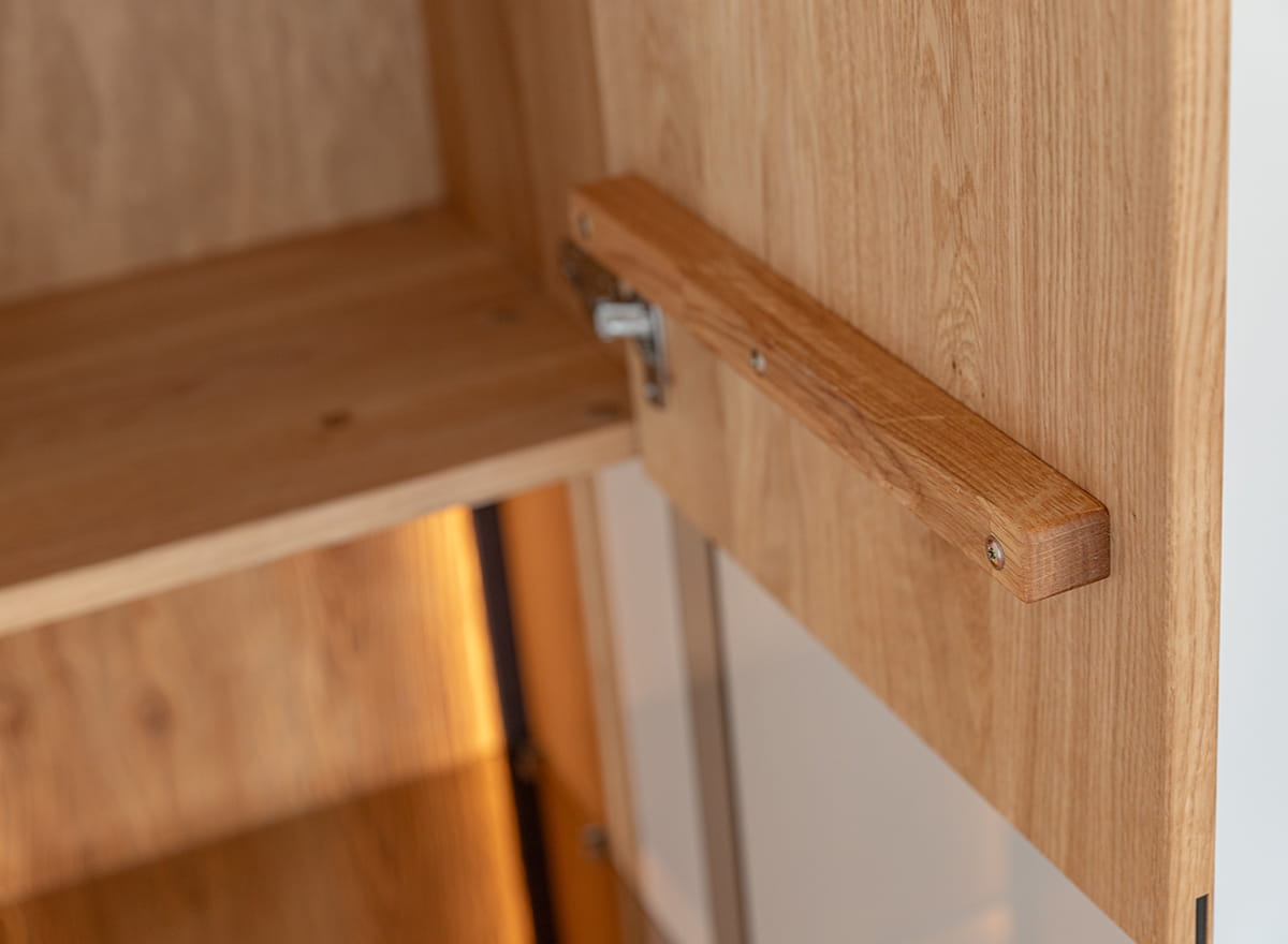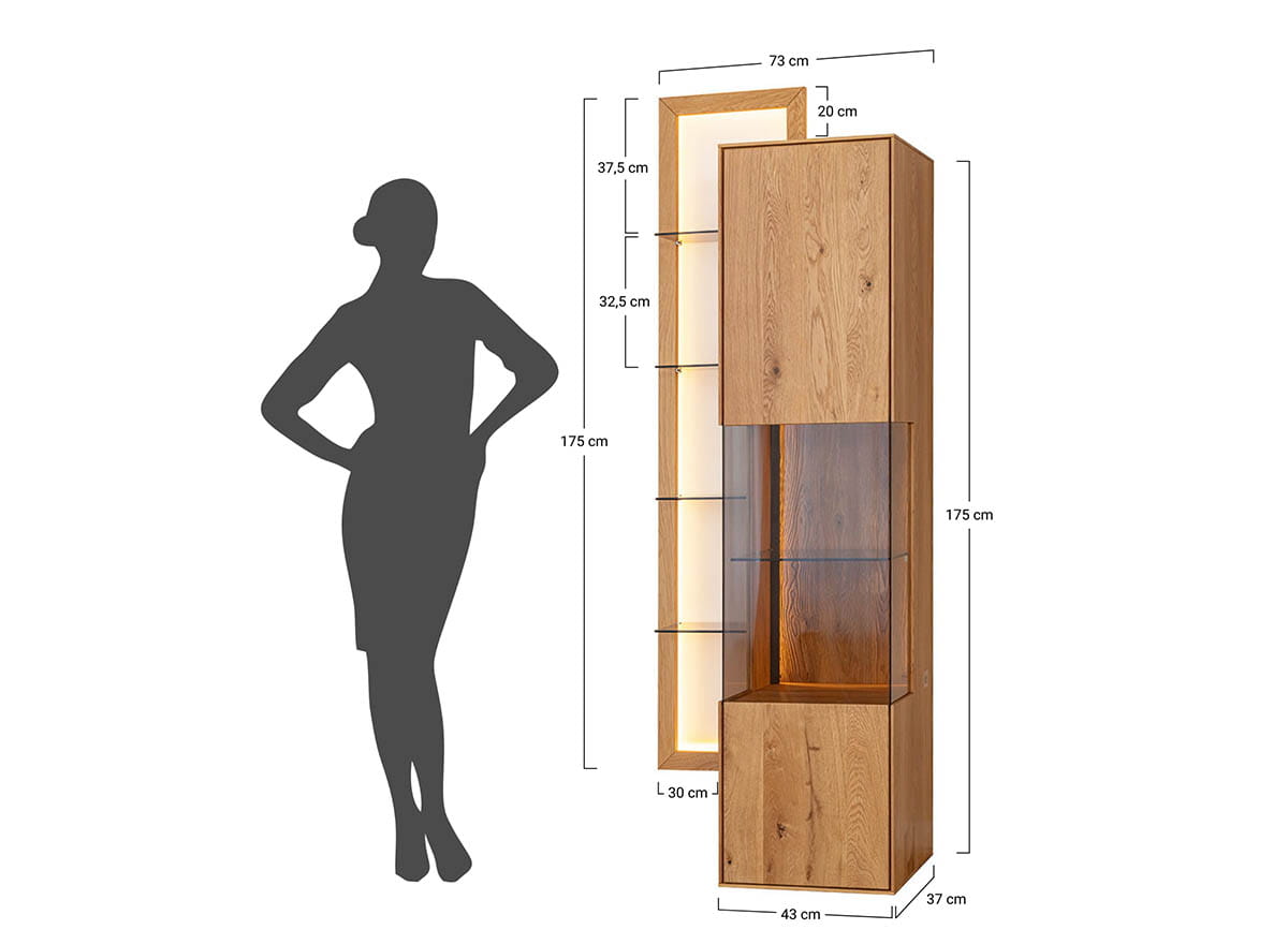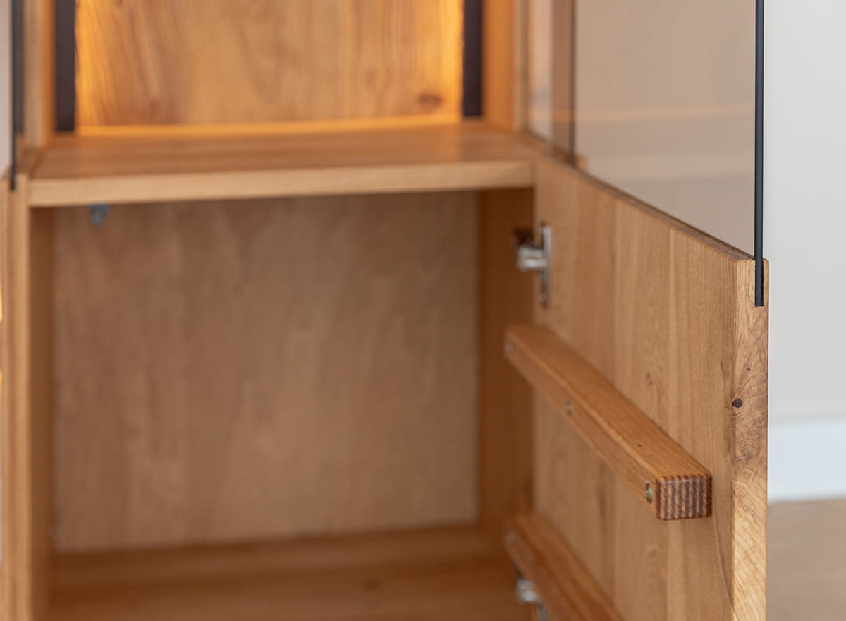 Olejovaný dub, z ktorého bola táto vitrína vytvorená, zaručuje nielen jej estetický vzhľad, ale aj dlhú životnosť. Jedinečný proces konzervácie dreva zaručuje, že nábytok vydrží dlhé roky. Starostlivá pozornosť venovaná každému, aj tomu najmenšiemu detailu, preto viedla k vytvoreniu výrobku, ktorý je subtílny a zároveň pevný vo svojej konštrukcii.