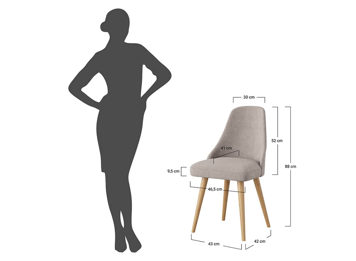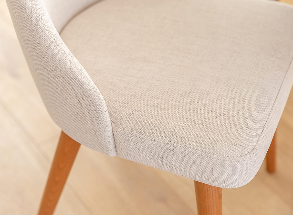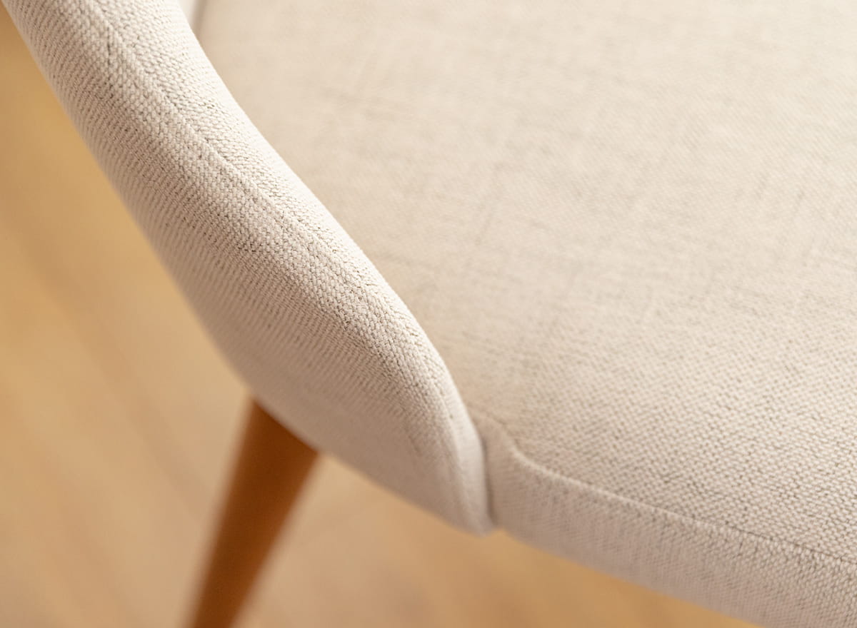 Čalúnená stolička s drevenými nohami sa vyznačuje teplým odtieňom béžovej, ktorý dokonale ladí s prírodnou farbou dreva. Vďaka tomu sa farba ľahko kombinuje s ostatnými, pretože je univerzálna, neutrálna a tlmená. Farebný odtieň sa môže líšiť v závislosti od nastavenia Vášho monitora.