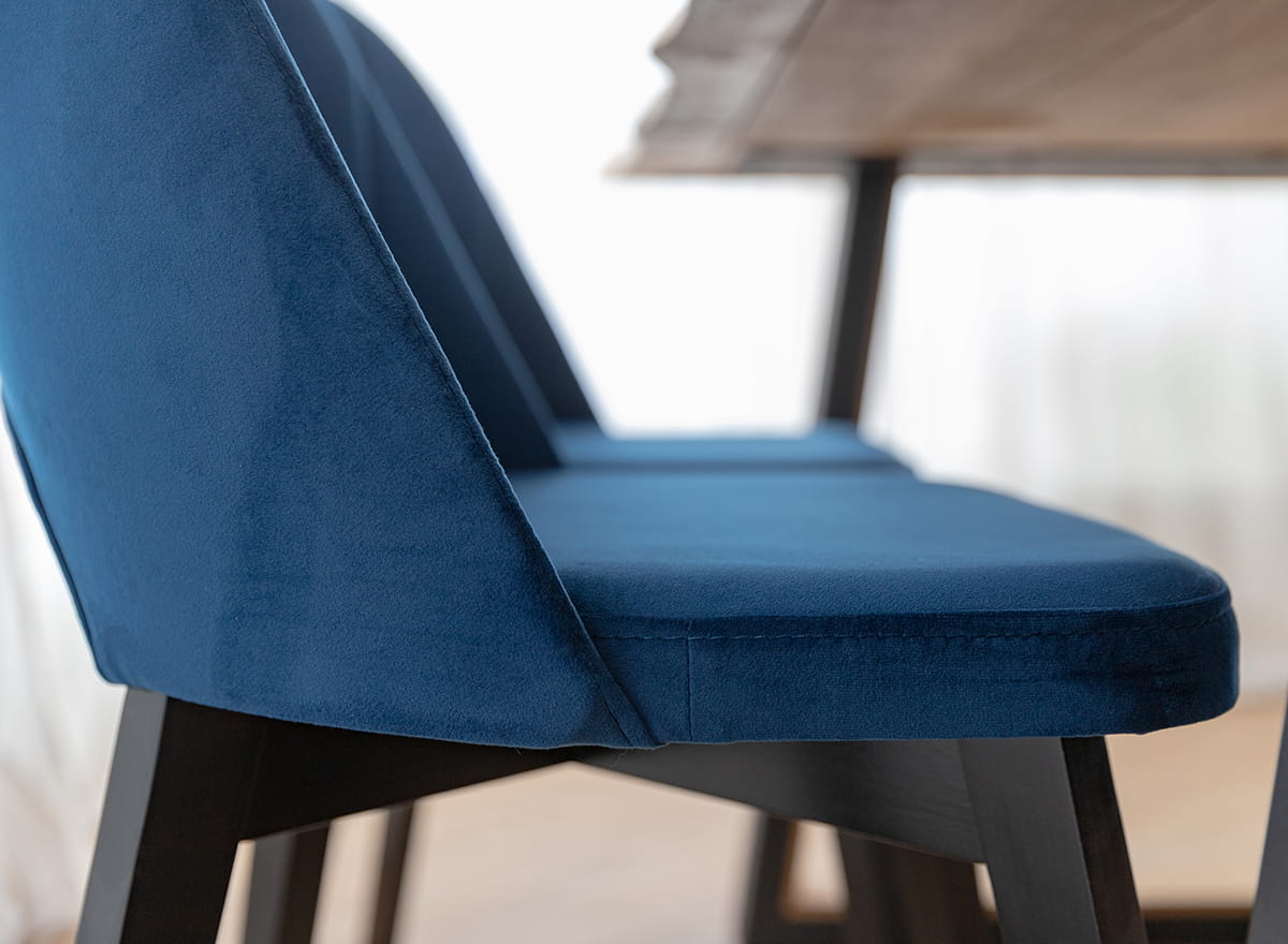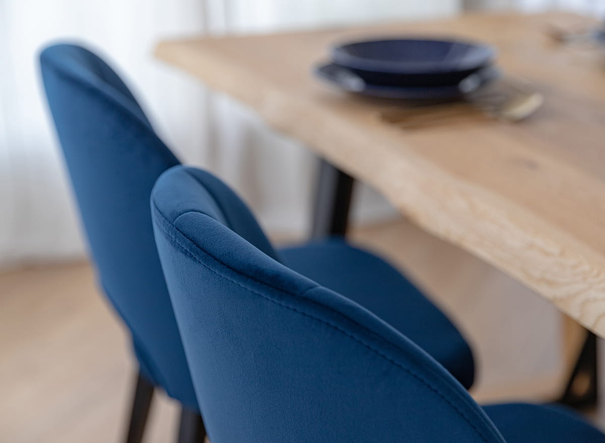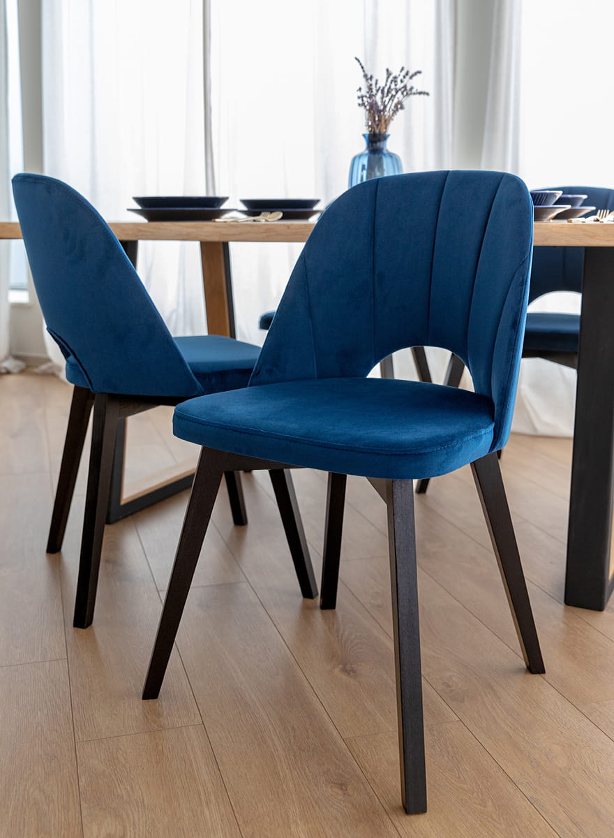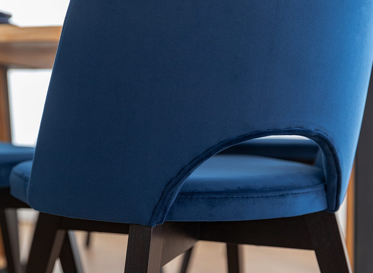 Tu prezentovaná stolička Breno sa od ostatných odlišuje tmavomodrým velúrovým čalúnením, ktoré dodá eleganciu každému interiéru. Jeho dizajn je premyslene navrhnutý tak, aby sa hodil do rôznych prostredí - od moderných až po tie s nádychom glamour. Vizuálna ľahkosť dosiahnutá úzkymi nohami z čierneho bukového dreva spôsobuje, že kreslo pôsobí ako jemný, ale výrazný a nápadný akcent v priestore. Jemný lesk velúru Riviera 81 upúta pozornosť a zároveň dodá interiéru sofistikovaný nádych.