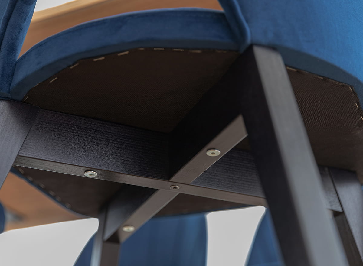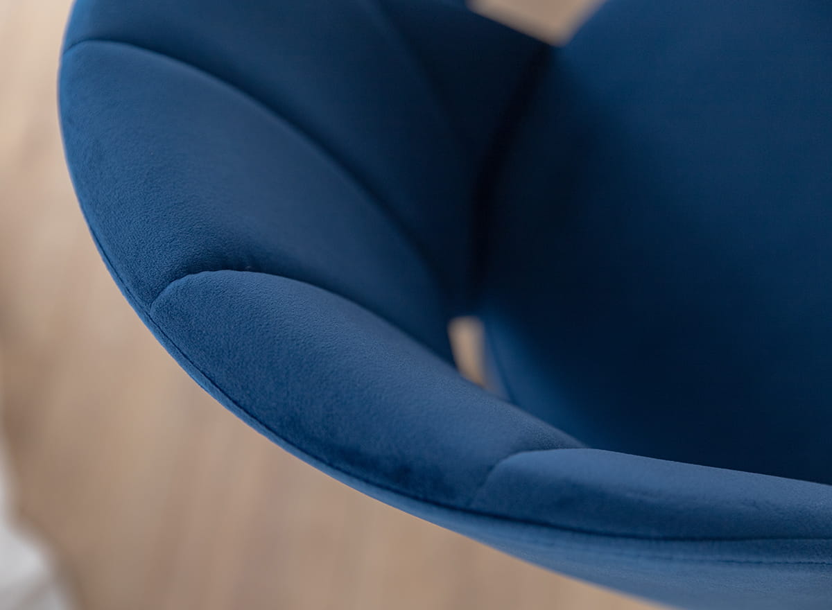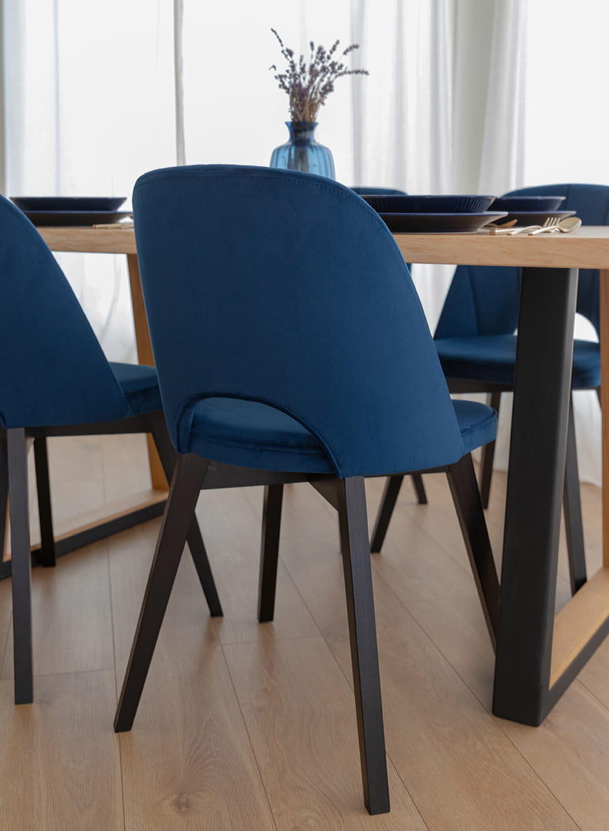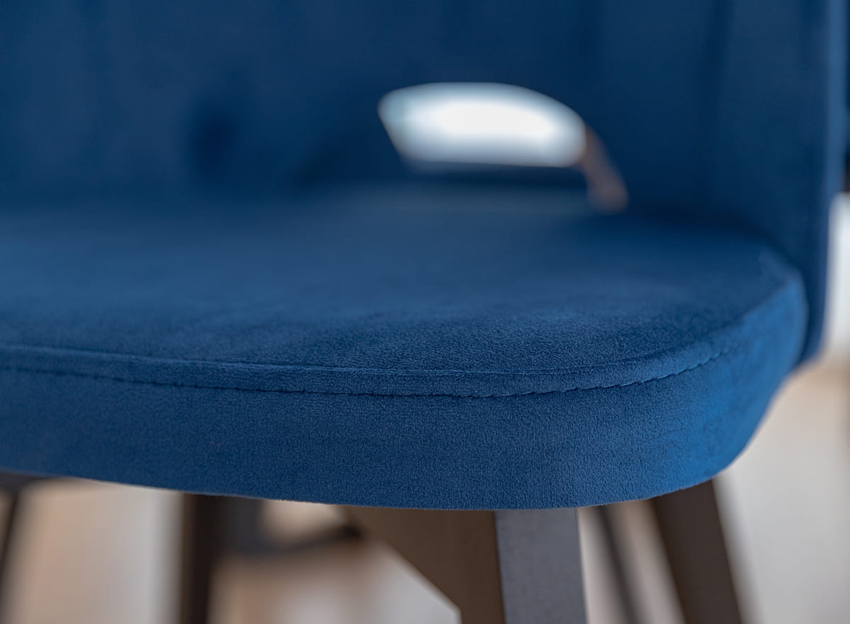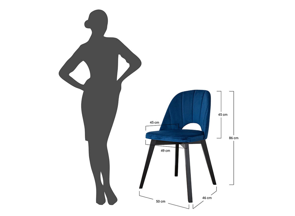 Tu prezentovaná stolička Breno sa od ostatných odlišuje tmavomodrým velúrovým čalúnením, ktoré dodá eleganciu každému interiéru. Jeho dizajn je premyslene navrhnutý tak, aby sa hodil do rôznych prostredí - od moderných až po tie s nádychom glamour. Vizuálna ľahkosť dosiahnutá úzkymi nohami z čierneho bukového dreva spôsobuje, že kreslo pôsobí ako jemný, ale výrazný a nápadný akcent v priestore. Jemný lesk velúru Riviera 81 upúta pozornosť a zároveň dodá interiéru sofistikovaný nádych.