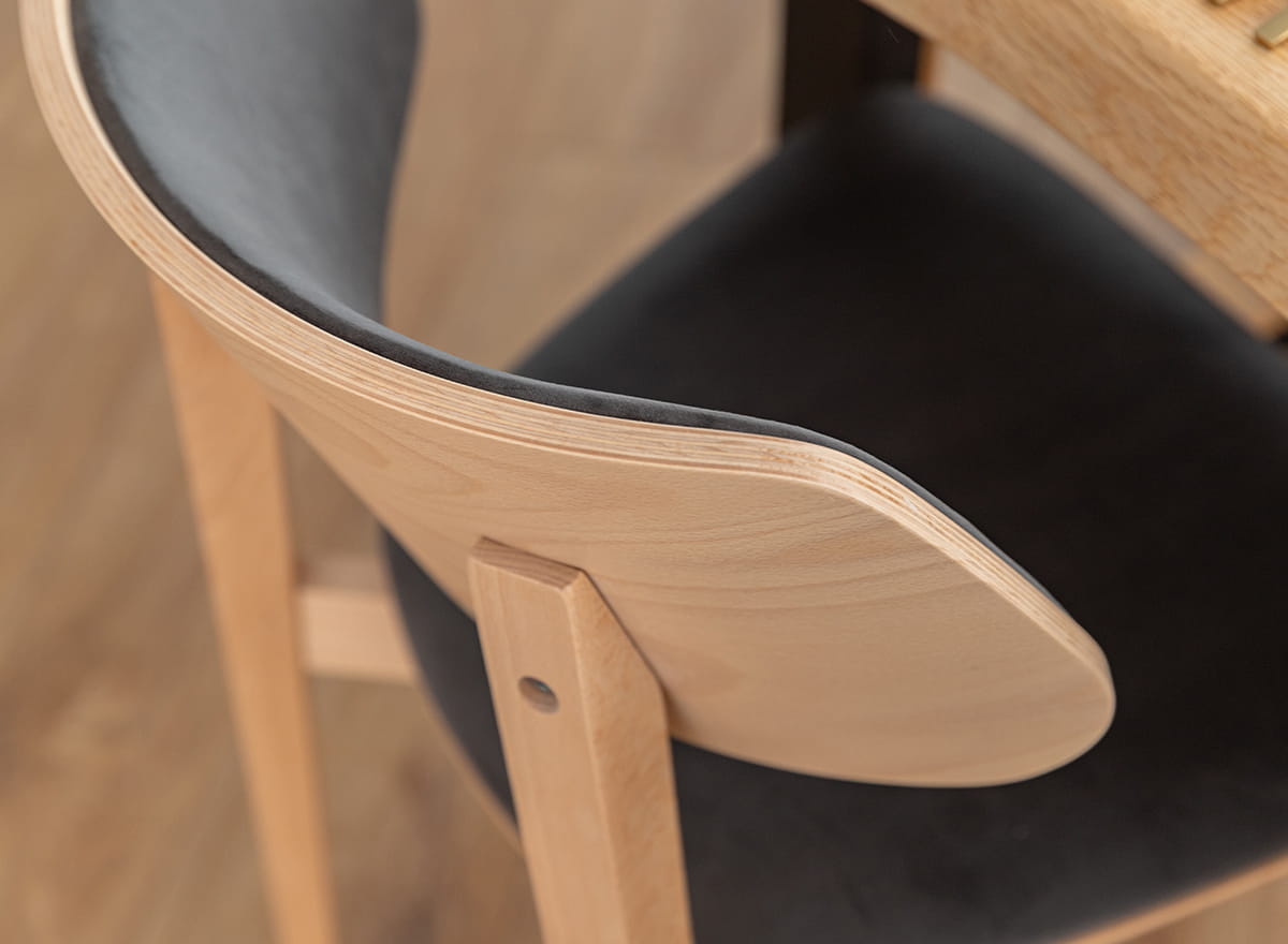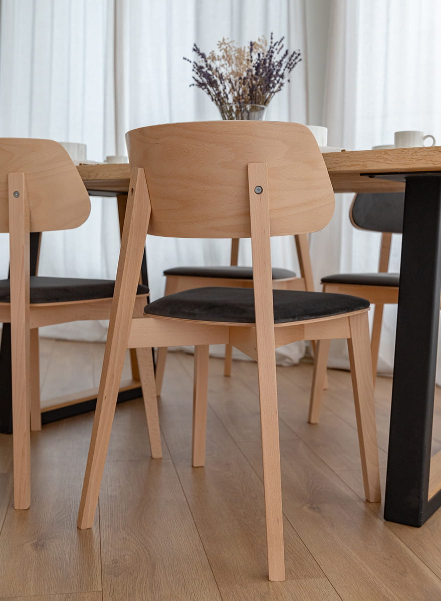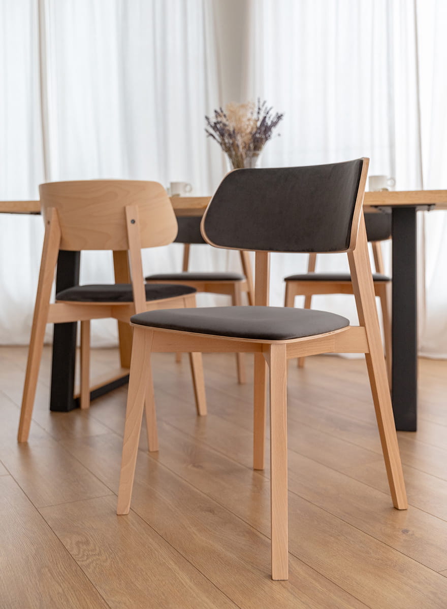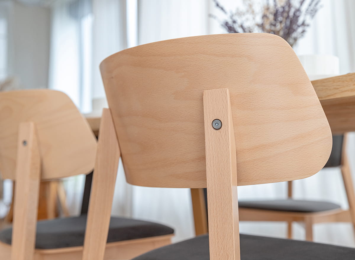 Bukové drevo, z ktorého sú vyrobené nohy stoličky, je obnoviteľný a udržateľný materiál, takže je plne ekologické. Drevo sa tiež ľahko opracováva a umožňuje vytvárať zložité tvary a vzory. Profilované operadlo a ergonomický tvar sedadla zabezpečujú pohodlie aj pri dlhom sedení, čo je dôležité z hľadiska ergonómie. Za zmienku stojí aj to, že látka Riviera je okrem svojej odolnosti mäkká a príjemná na dotyk, čo zvyšuje úroveň každodenného pohodlia. Táto stolička teda spája odolnosť prírodných materiálov s moderným dizajnom, čím reaguje na potreby uvedomelých spotrebiteľov, ktorí hľadajú nábytok s dušou.