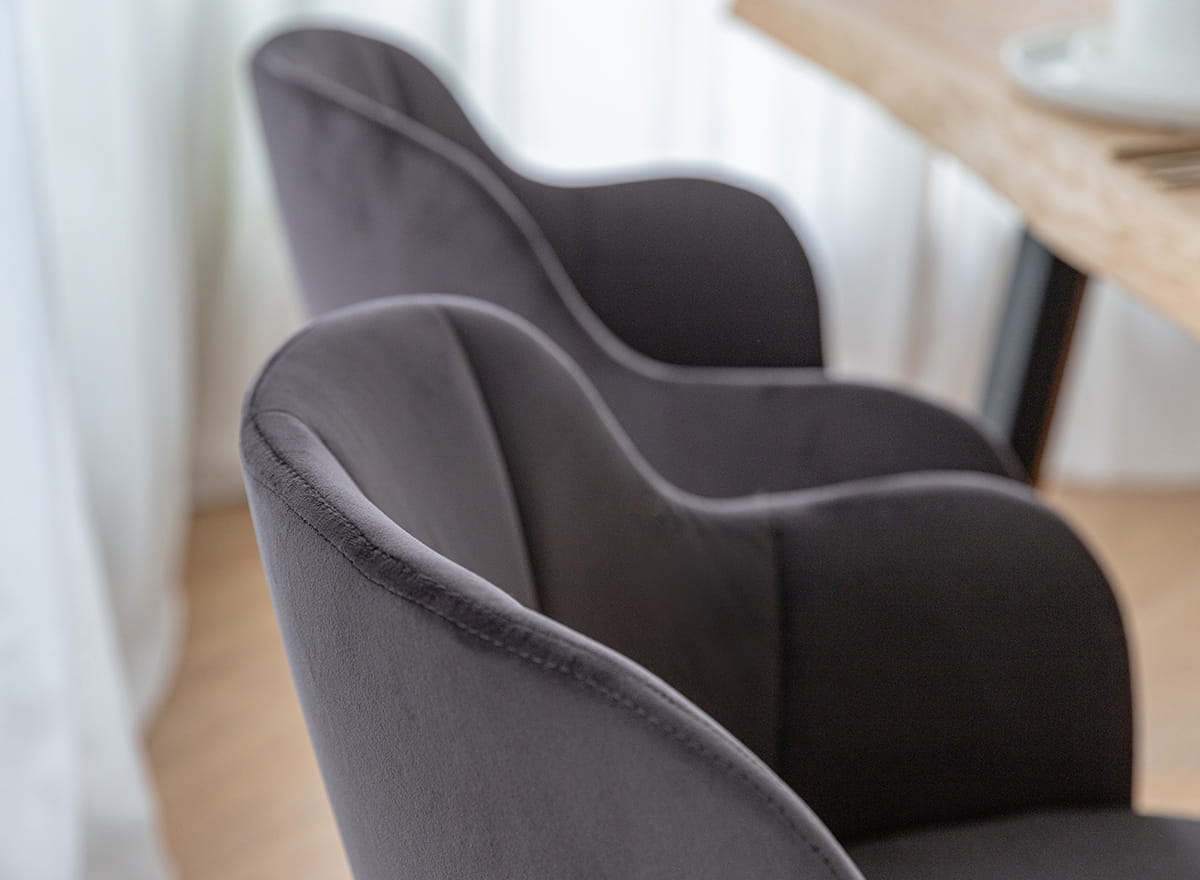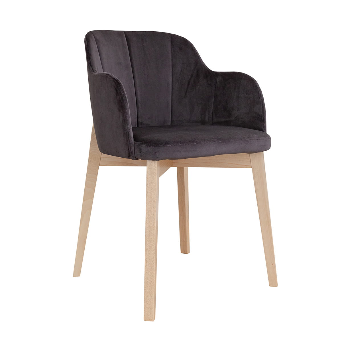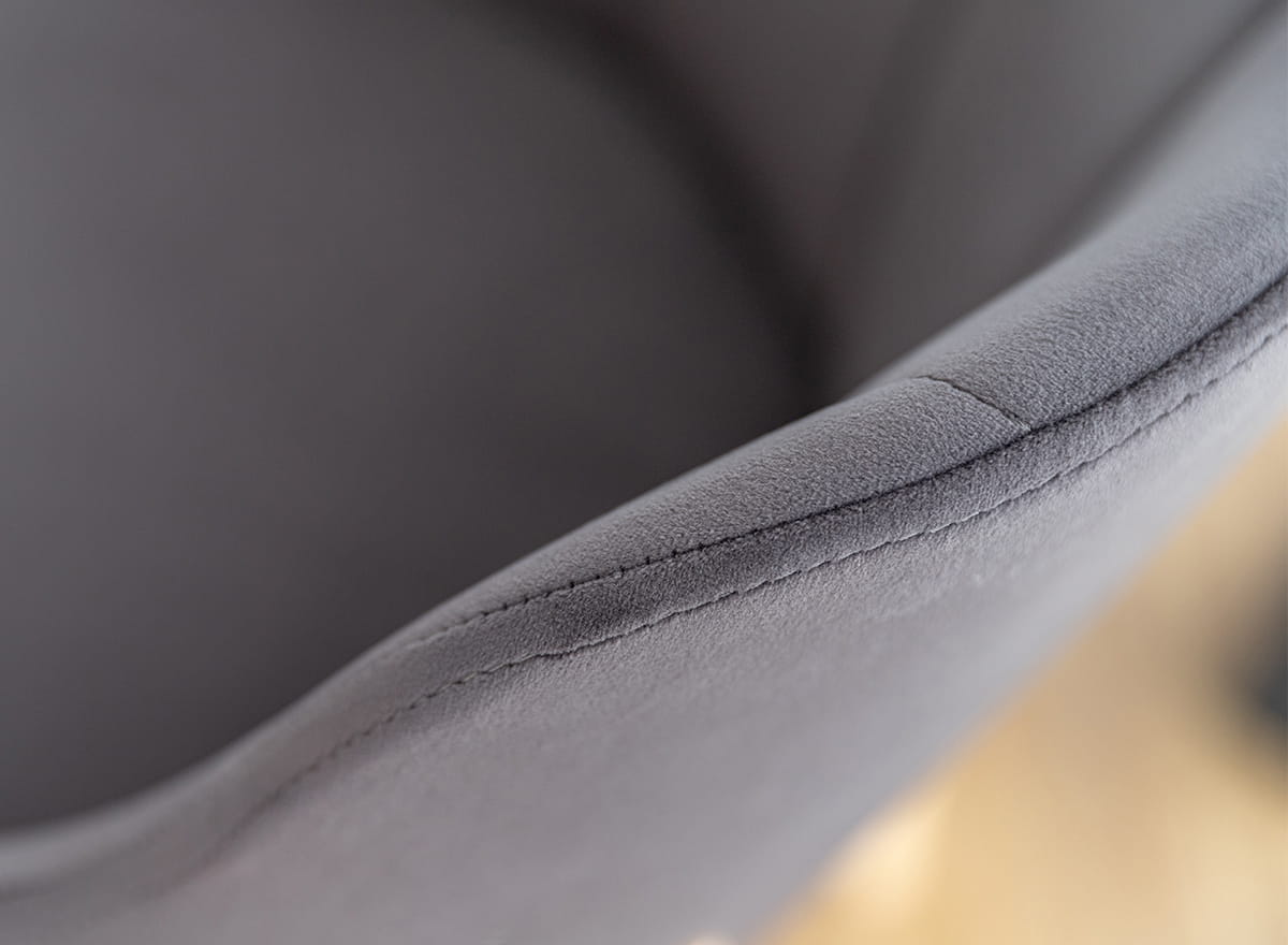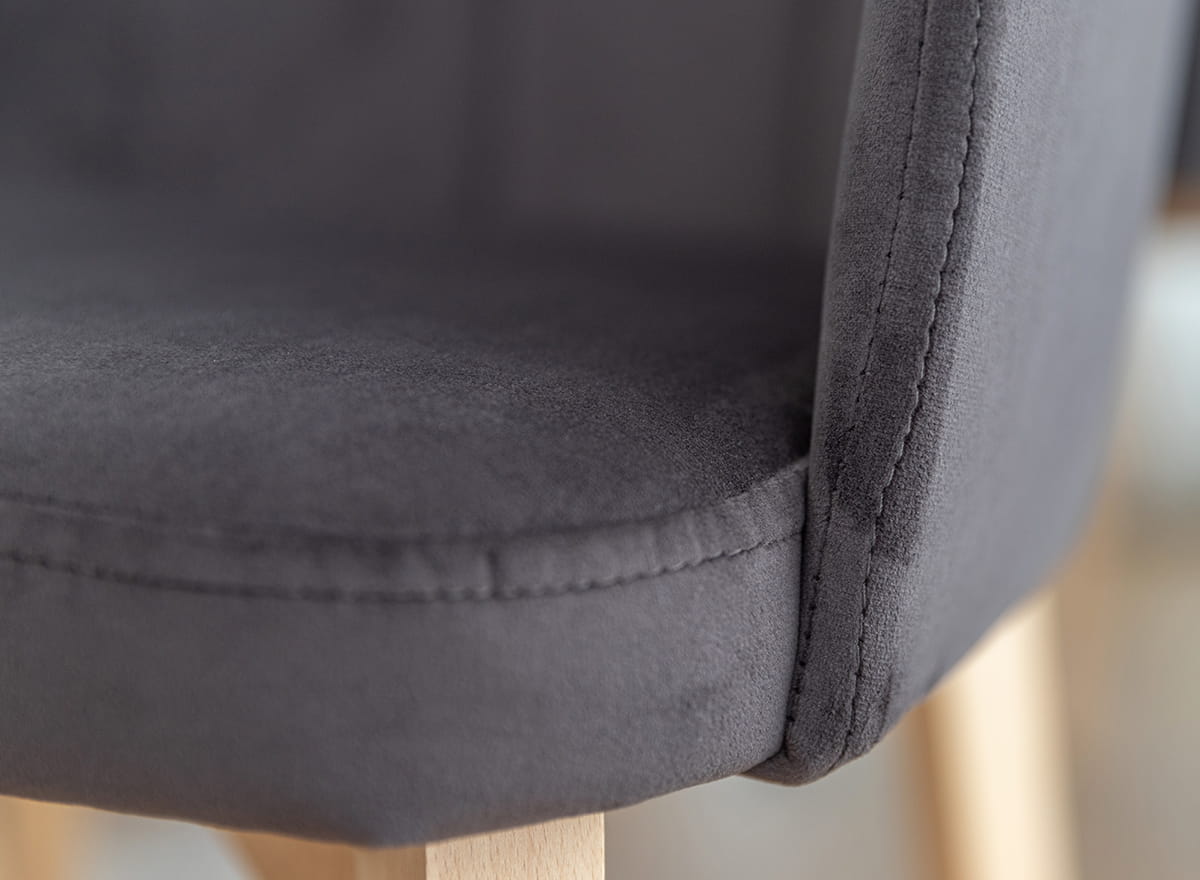 Stolička Fondo je stelesnením minimalistického dizajnu a jeho kombinácie s funkčnosťou. Sivá zamatová tkanina, ktorá sa na svetle leskne svojou štruktúrou, prináša do interiérov príjemnú textúru, ktorá ladí s prírodnými dekoratívnymi prvkami a rôznymi štýlmi - od moderných až po klasické aranžmány. Ľahká konštrukcia a štíhle nohy zo svetlého bukového dreva zdôrazňujú estetickú rovnováhu, vďaka čomu je kreslo ideálne do priestorov, kde má dizajn podporiť pocit priestrannosti.