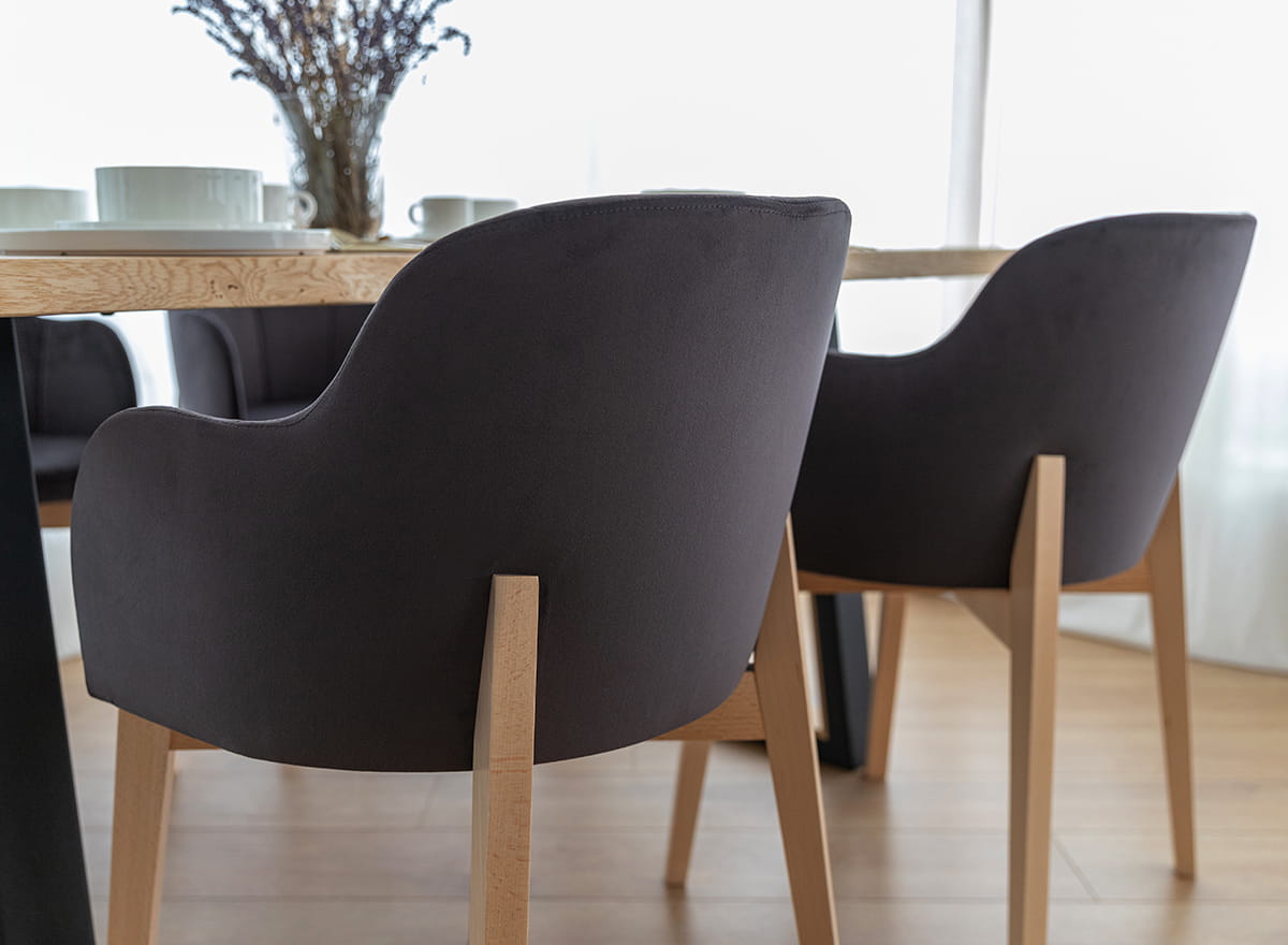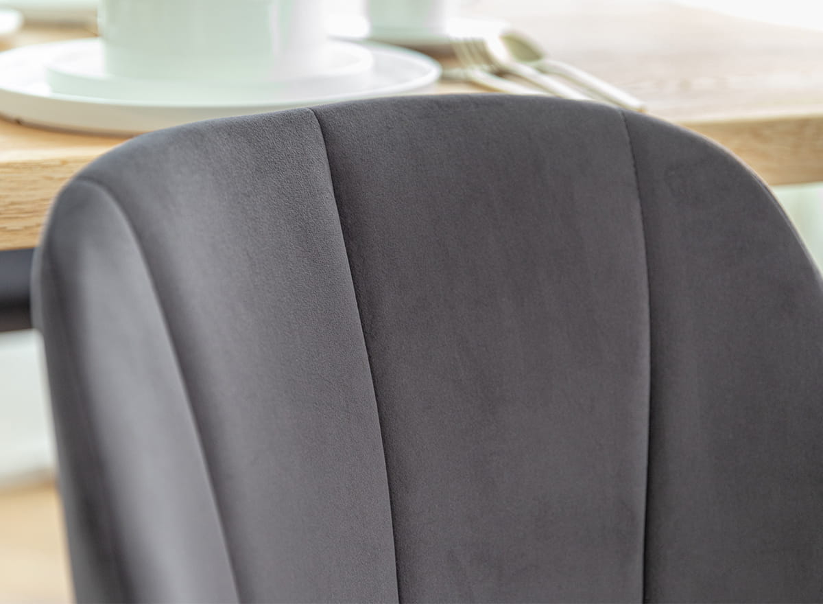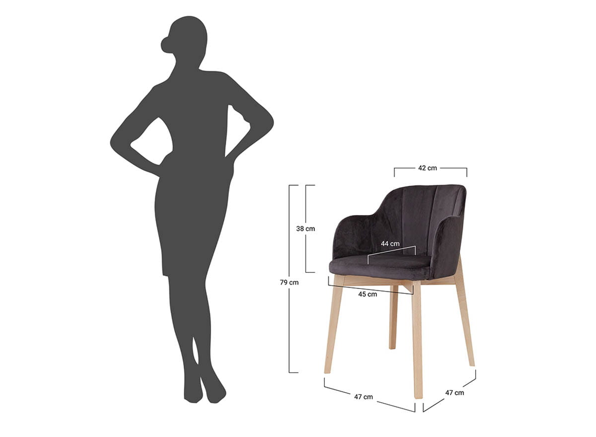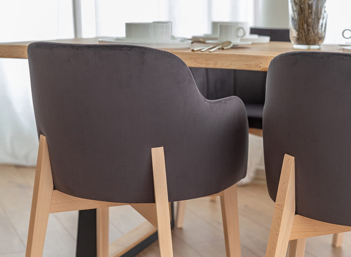 Stolička Fondo je stelesnením minimalistického dizajnu a jeho kombinácie s funkčnosťou. Sivá zamatová tkanina, ktorá sa na svetle leskne svojou štruktúrou, prináša do interiérov príjemnú textúru, ktorá ladí s prírodnými dekoratívnymi prvkami a rôznymi štýlmi - od moderných až po klasické aranžmány. Ľahká konštrukcia a štíhle nohy zo svetlého bukového dreva zdôrazňujú estetickú rovnováhu, vďaka čomu je kreslo ideálne do priestorov, kde má dizajn podporiť pocit priestrannosti.