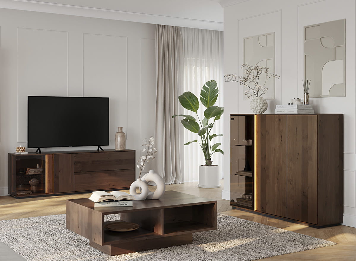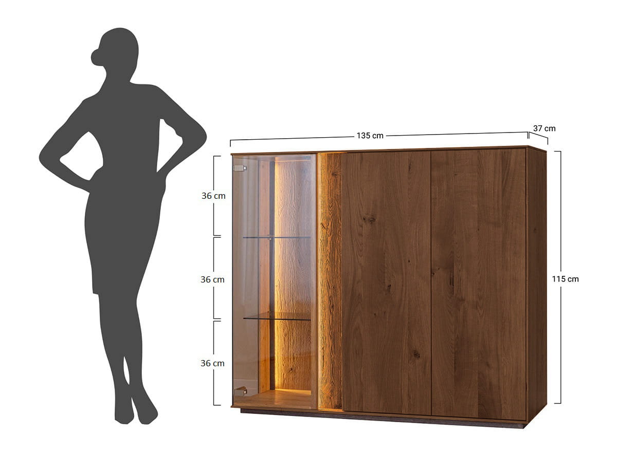 Nízka trojitá vitrína Collodi úspešne kombinuje dizajn, praktickosť a kvalitu, ktorú očakávate. Dominuje teplý odtieň tabaku, výrazná kresba divokého duba a olejovaná povrchová úprava - to všetko (a ešte viac) spôsobuje, že drevo pôsobí prirodzene, ale zároveň nadmieru štýlovo. Nie je to len miesto na dekoráciu, ale prvok, ktorý vnáša do priestoru poriadok a dodáva každému interiéru útulnosť. Jeho jednoduchý tvar a jemné presklenie mu dodávajú ľahký nádych, zatiaľ čo LED podsvietenie dotvára atmosféru najmä večer.