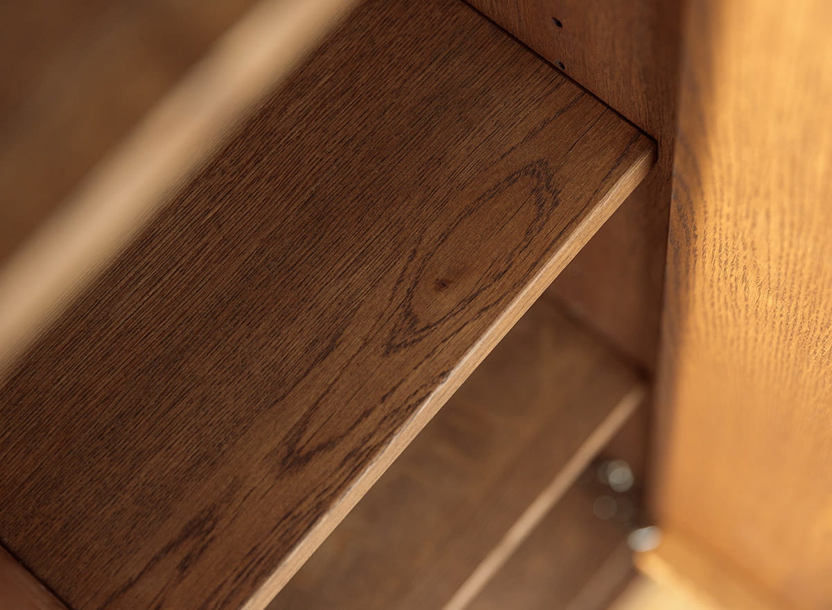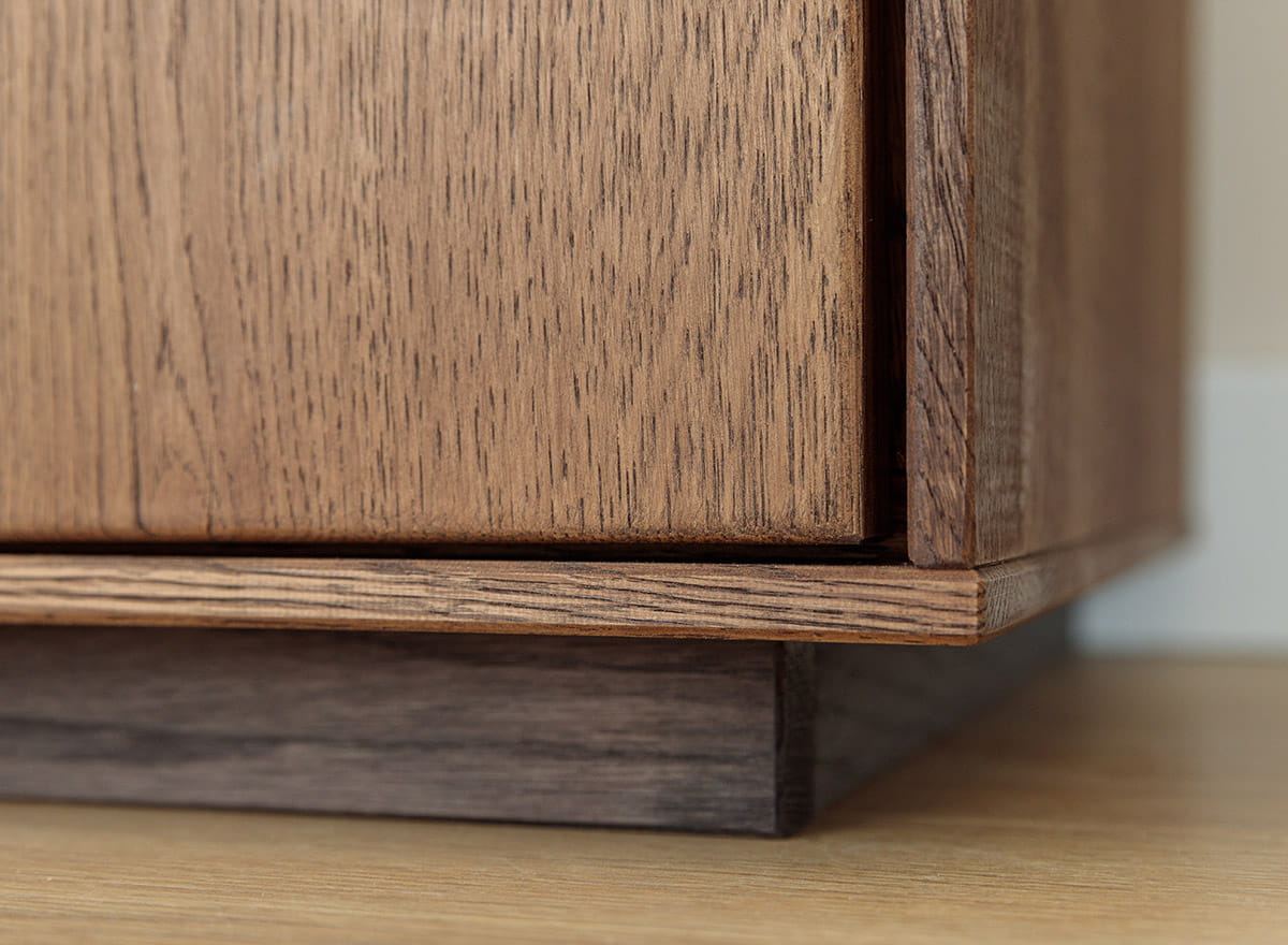 Dubové drevo je zárukou odolnosti - tvrdé, pevné, ale príjemné na dotyk. Olejovaný povrch chráni pred poškriabaním a každodenným opotrebovaním a vďaka systému tip-on môžete skrinky otvárať ľahkým dotykom. Žiadne úchyty, žiadne prekážajúce doplnky - čistá forma, ktorá sa hodí do každého štýlu interiéru; od moderného až po klasický. Stabilná konštrukcia zaručuje, že nábytok vydrží roky bez stopy únavy.