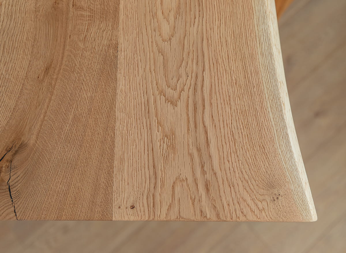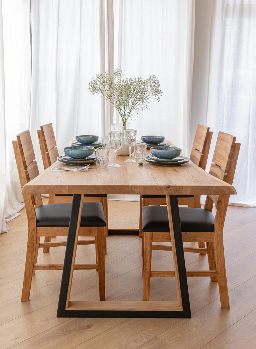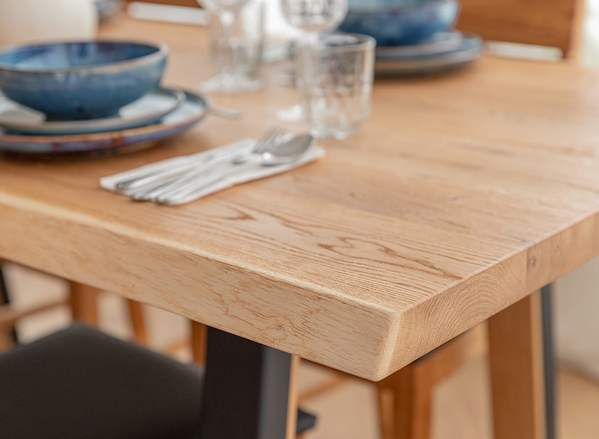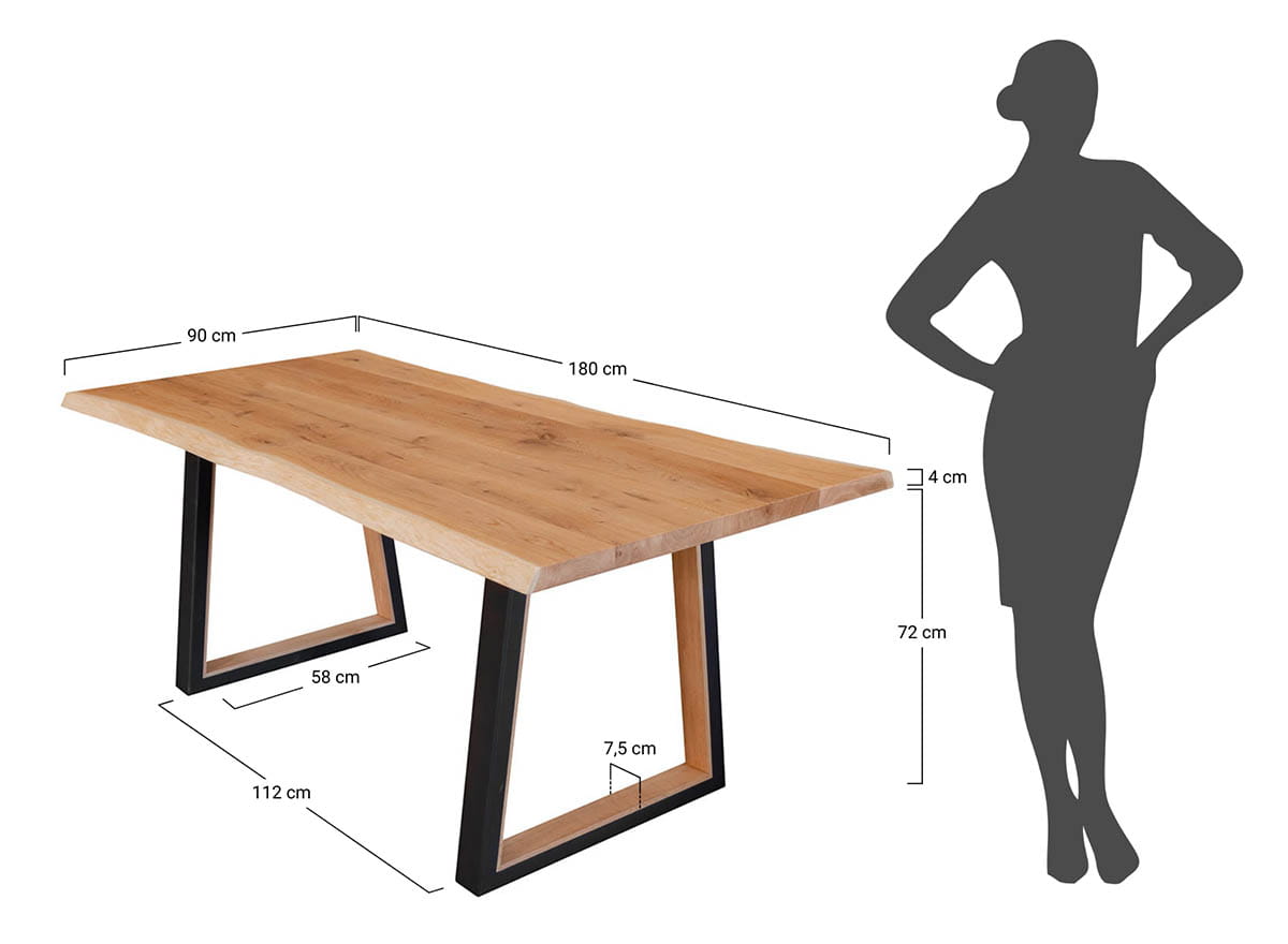Aby sa zachoval čo najprirodzenejší vzhľad, dubové drevo sa naolejovalo. Vosk na drevo, ktorý sa potom naniesol, poskytol ďalšiu ochrannú vrstvu na povrchu nábytku. Minimalistická povrchová úprava stola má za následok krásnu kresbu a súkna, ktoré je možné vidieť na jeho povrchu. Bude ozdobou rustikálnych a loftových interiérov, ako aj miestností v škandinávskom štýle, ktoré kladú dôraz na masívny drevený nábytok. Stôl má rozmery 90x180 cm. Hrúbka vrchnej dosky je 4 cm.