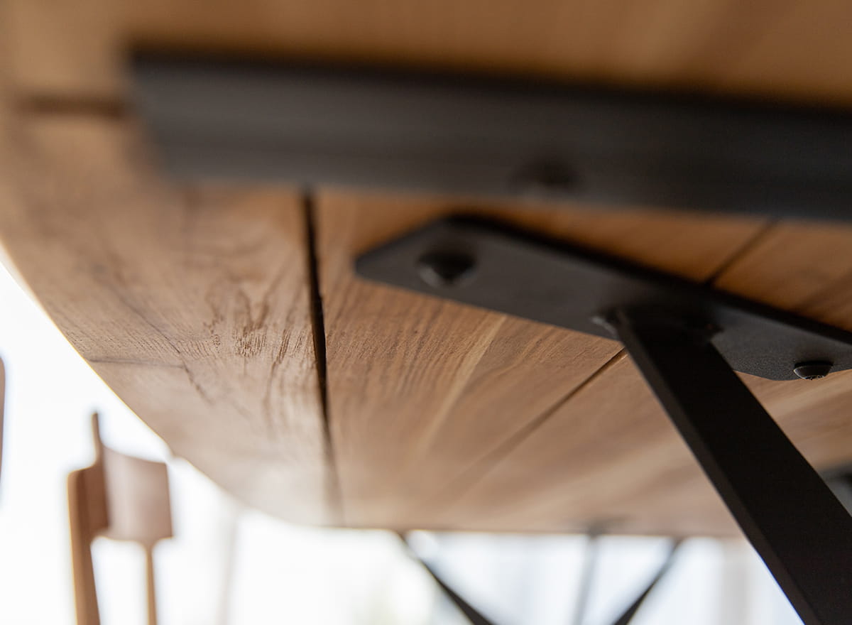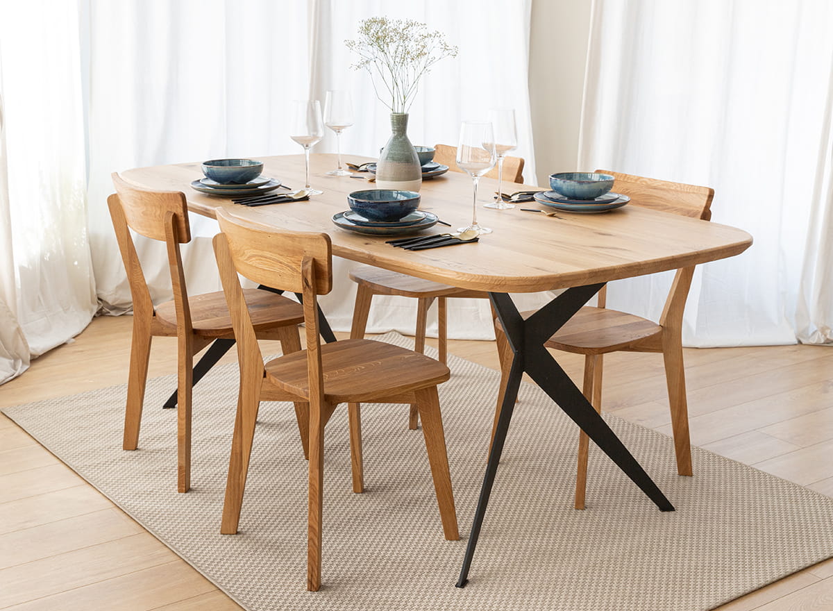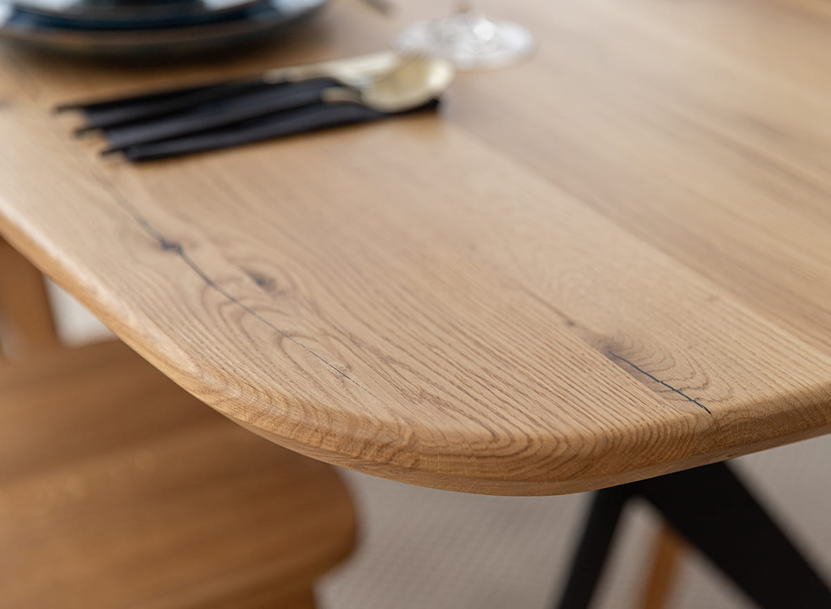 Dubový stôl s čiernymi nohami dokonale doplní priestor, v ktorom sa kladie dôraz na originalitu a nekonvenčnosť. Stolová doska s viditeľnými letokruhmi a sukmi upúta pozornosť a podčiarkuje jedinečnosť tohto kúsku. Zároveň dokazuje, že je jediný svojho druhu, a teda jedinečný. Oválny tvar stola poskytuje pohodlné sedenie pre viacero osôb a napomáha konverzácii, keďže všetci sú pohodlne otočení k sebe.