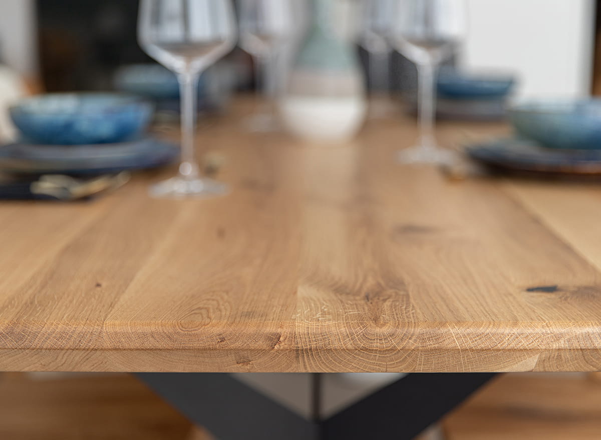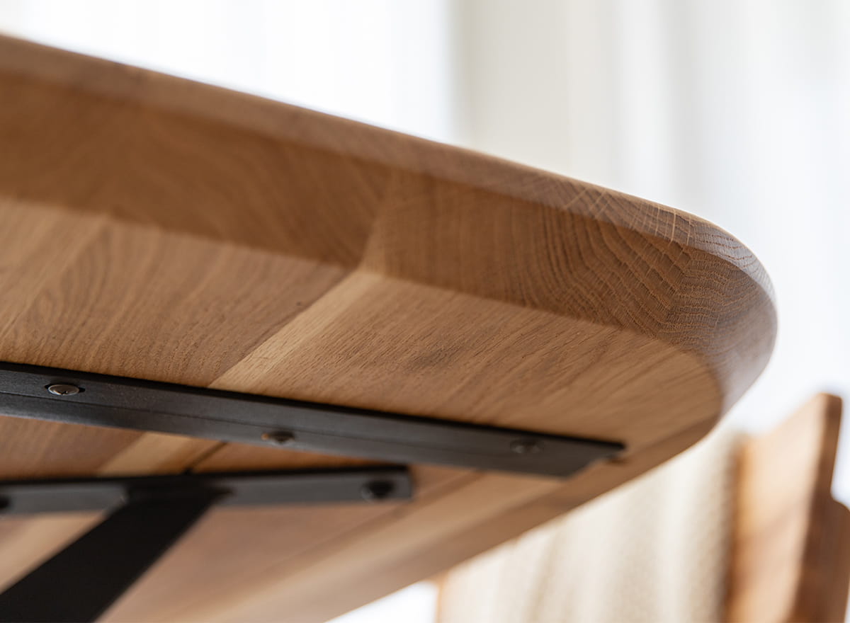 Prezentovaný stôl na kovových nohách z dubového masívu je medzi našimi zákazníkmi mimoriadne obľúbený z dobrého dôvodu. Hlavným rozlišovacím znakom, samozrejme okrem samotného dizajnu, je kombinácia dvoch kontrastných materiálov - kovu a dreva. Vrchná doska s hrúbkou 4 cm bola vyrobená z dubového dreva, ktoré bolo starostlivo naolejované, čo zaručuje jeho mimoriadnu trvanlivosť a odolnosť voči väčšine poškodení, poškriabaniu, zmene farby a stmavnutiu. Na jej okrajoch boli tiež skosené hrany, čo jej dodáva moderný vzhľad, ale aj vizuálnu ľahkosť.