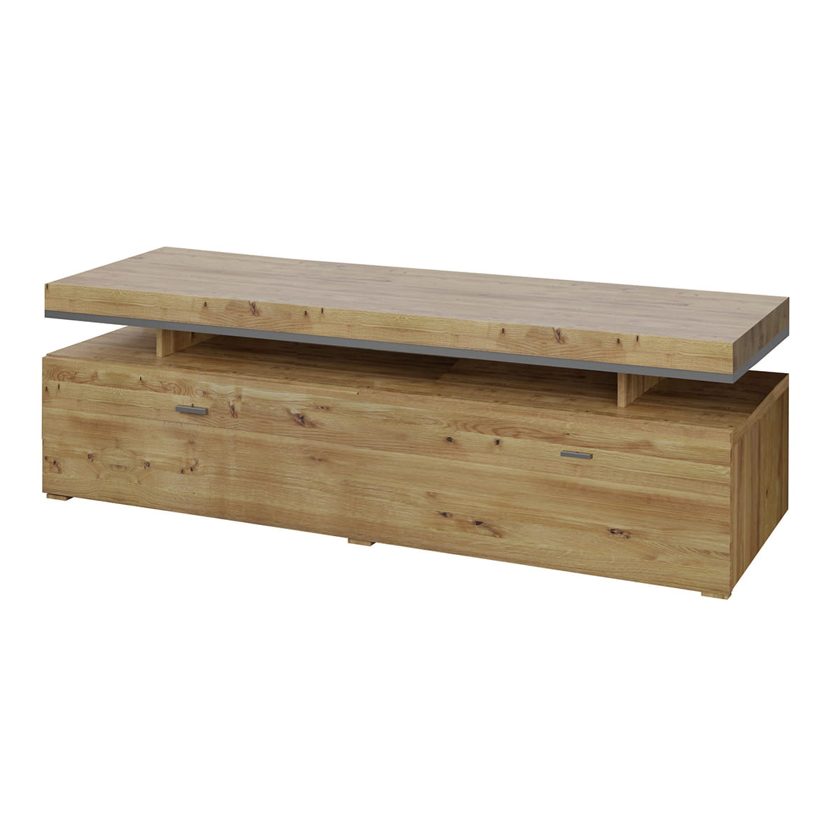 Vďaka výraznej štruktúre a tmavým veľkým uzlom, ako aj jednoduchým tvarom a ostrým hranám pôsobí táto TV komoda do obývacej izby veľmi moderne. Čo si však zaslúži osobitnú pozornosť, je jej farba. Krásny odtieň bieleného duba dokonale ladí so sivou hliníkovou vložkou viditeľnou pod hornou časťou. Osadená na zdanlivo jemných doskách tak trochu pripomína lavičku v parku. Treba dodať, že pod ňu môžeme nainštalovať LED osvetlenie ( dodatočná možnosť).
