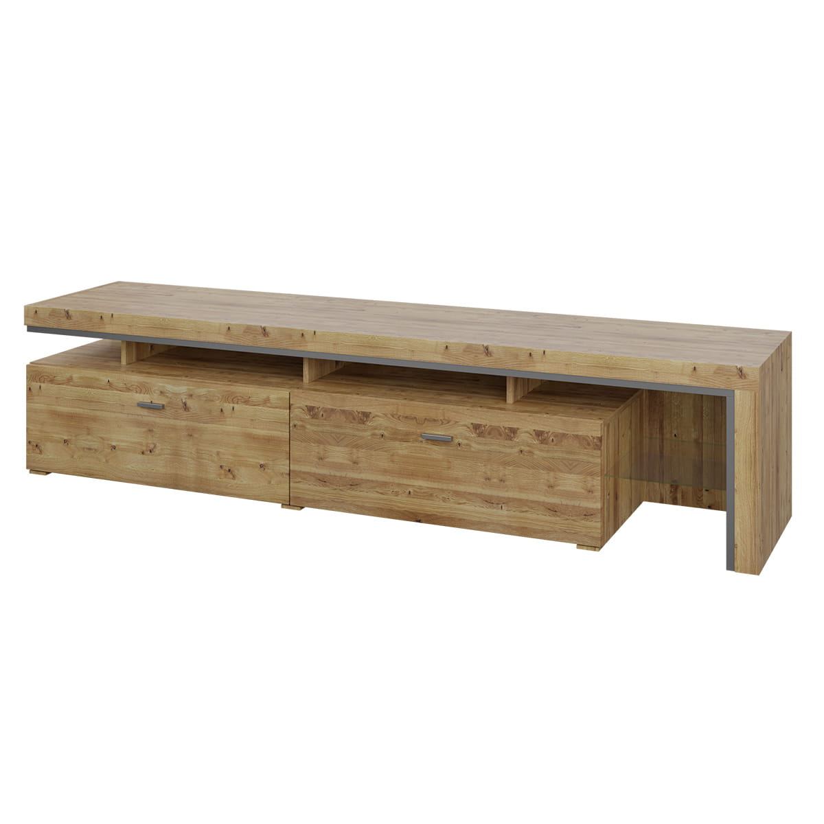 TV skrinka do obývacej izby San Gusto umožňuje umiestniť pomerne veľa zariadení nielen na dosku, ale aj priamo pod ňu. Uľahčia vám to vnútorné otvorené police a priestor vedľa zásuviek, v ktorom je umiestnená sklenená polica. Môžete tam umiestniť napríklad subwoofer. Na želanie vám do priestoru pod doskou umiestnime LED osvetlenie, ktoré vám uľahčí používanie skrinky po zotmení.