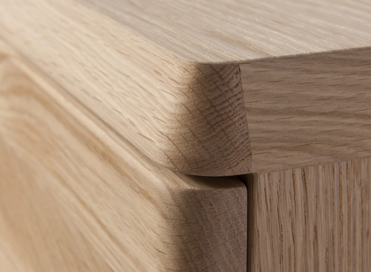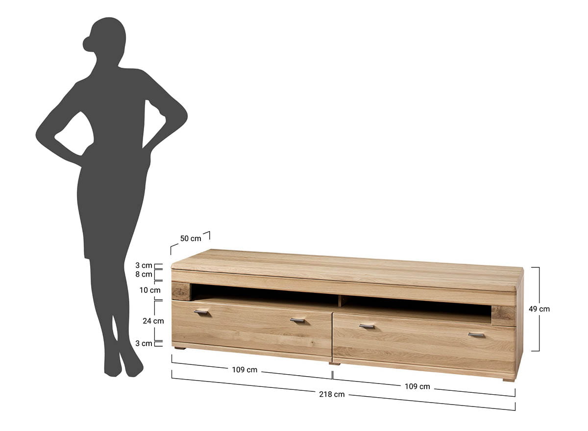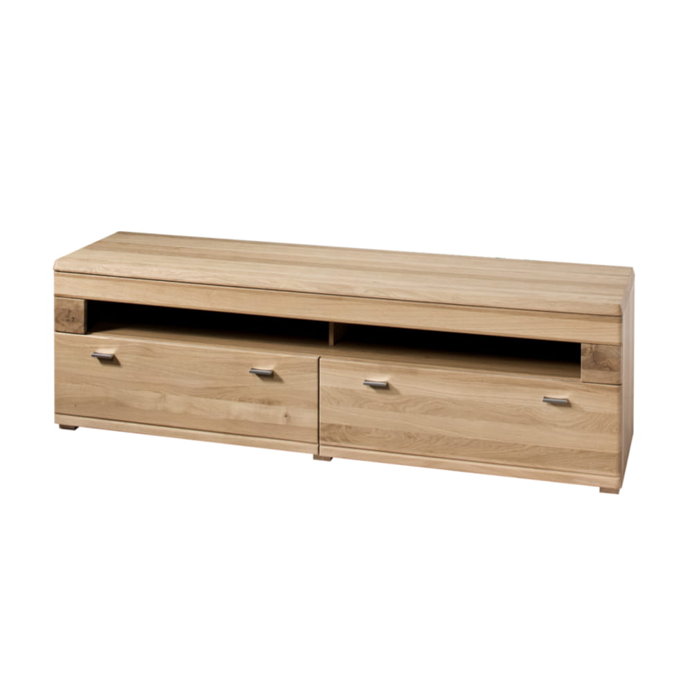Povrch tejto veľkej dubovej skrinky TV bol ošetrený ochranným olejom s bielym pigmentom. Vďaka tomu si kus nábytku dlhšie zachová svoj "surový" odtieň. Aj vďaka tomu na ňu môžete bezpečne umiestniť rôzne predmety, ktoré nezanechajú stopu. Napríklad prehrávač alebo audioprehrávač. Set-top box a router sa zasa bez problémov zmestia na vnútorné police a vaša zbierka filmov do dvoch hlbokých zásuviek. To však nie je všetko, čo tento nábytok ponúka.