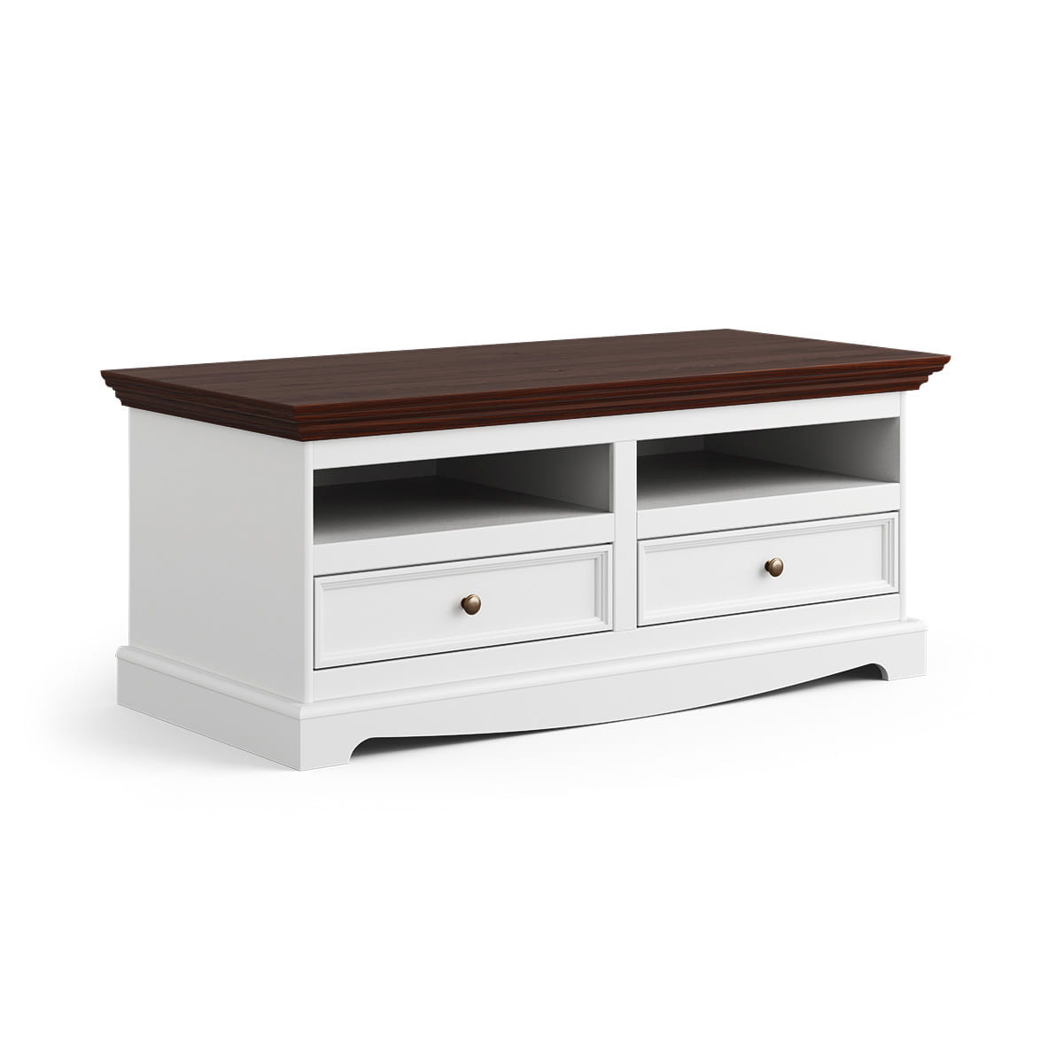 TV stolík bol vyrobený z najkvalitnejšieho fínskeho borovicového dreva, ktoré zaručuje jeho odolnosť. Drevo je natreté teplým odtieňom bielej a tmavého orecha. Táto kombinácia je veľmi elegantná a nadčasová. Volány na zásuvkách, ktoré sú charakteristickým prvkom radu Belluno, dodávajú nábytku šmrnc. Dopĺňajú ho okrúhle rukoväte v starožitnom zlate.