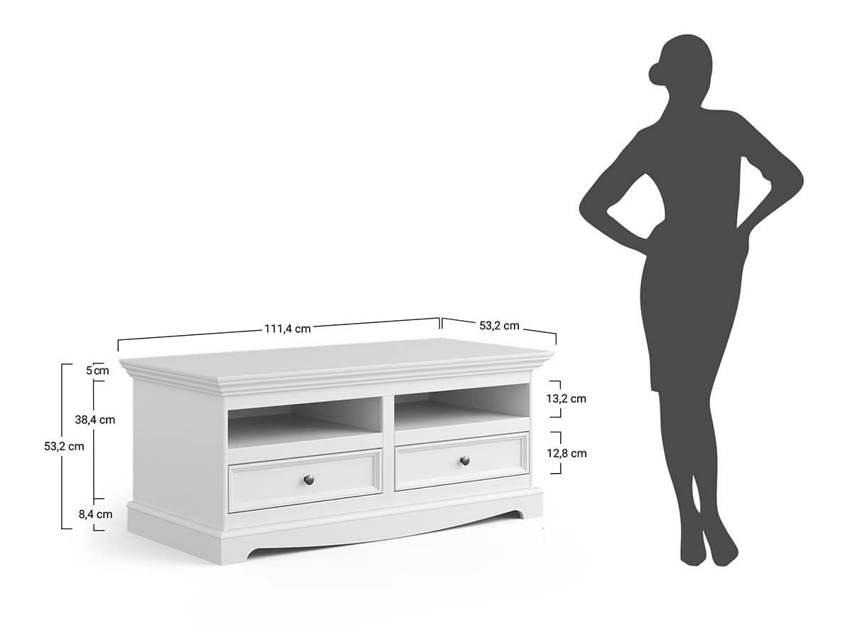 Biela TV komoda s orechovou doskou má dve priestranné zásuvky a dve priehradky, do ktorých môžete uložiť napríklad svoju zbierku DVD. Silná horná časť (5 cm) je zároveň pevným základom na umiestnenie televízora alebo iných drahých predmetov. Drevená TV komoda sa hodí k ostatnému nábytku v bielej farbe - orech. Môže byť tiež zaujímavým doplnkom celého radu Belluno Elegante. Hodí sa aj do iných zbierok.