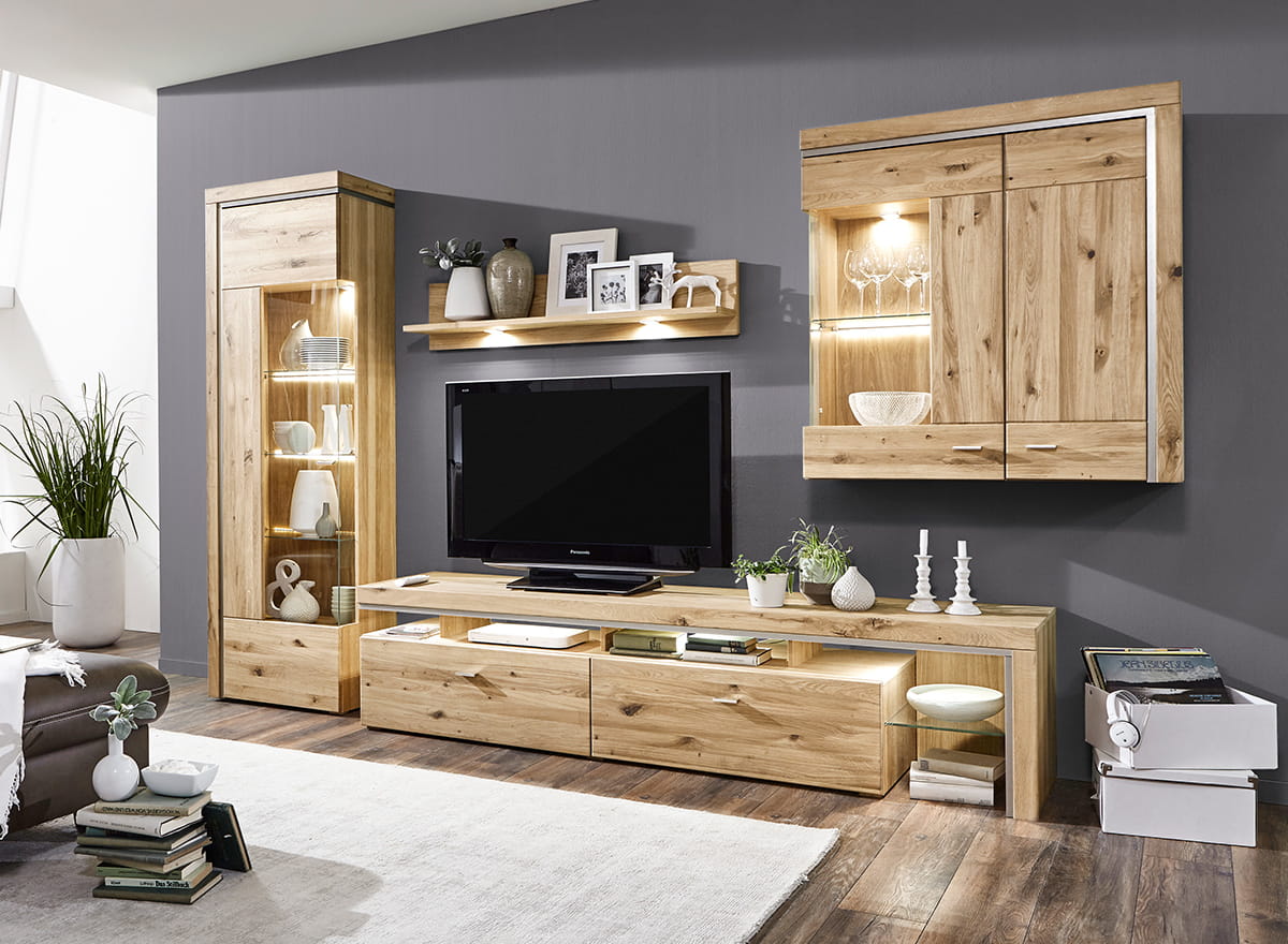 Rovnako dôležitá ako materiály použité na výrobu nábytku je aj jeho funkčnosť. Koniec koncov, dubový nábytok do obývacej izby tohto typu vám má pomôcť zorganizovať priestor a umožniť vám uložiť rôzne predmety. Pre bezproblémový prístup sme v tejto vitríne použili dvojité dvierka, z ktorých jedno je so sklom. Sklo odhaľuje vnútro police, do ktorej môžete v prípade záujmu nainštalovať osvetlenie. To nie je štandardným vybavením, ale výrazne uľahčuje používanie vitríny.