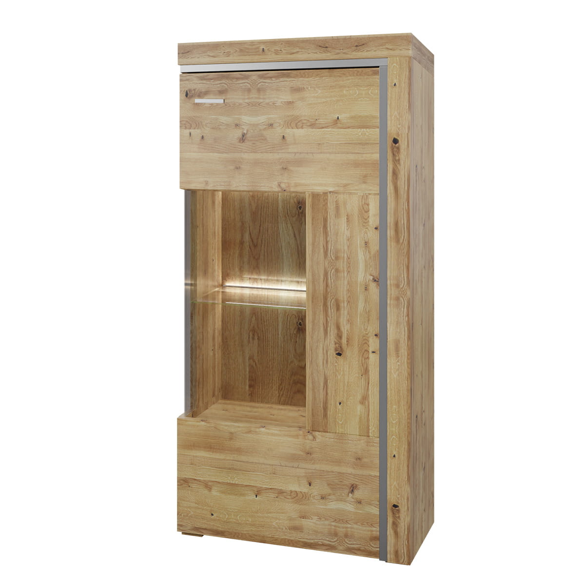 Nielen výrazná štruktúra a suky dodávajú tejto vitríne individuálny charakter. Okrem krásneho odtieňa bieleného duba sa o to starajú aj alumíniové vložky. Tie dodávajú dubovej vitríne San Gusto moderný vzhľad. A ak jej chcete dodať ešte modernejšie prvky, môžeme do nej nainštalovať LED osvetlenie.